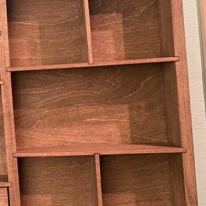 Showcase your treasures with this handcrafted, wall-mounted display shelf. Solid wood construction. Designed to hold your most cherished small items, this versatile organizer features 44 compartments in varying sizes- perfect for crystals, nature finds, miniatures, tincture bottles, and other collectables.